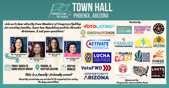 Join us to hear directly from U.S. Congresswoman Yassamin Ansari (AZ-03), Congresswoman Adelita Grijalva (AZ-07), Congresswoman Sara Jacobs (CA-51), and Congresswoman Emily Randall (WA-06), fighting for working families and learn how Republican policies threaten Arizonans—from raising costs to rollbacks on climate protections and assaults on the rule of law and reproductive freedom. We'll also confront the administration’s attacks on immigrants, which have torn apart communities and eroded constitutional protections, as well as the ongoing failure to ensure transparency and accountability for corruption at the highest levels of power.
